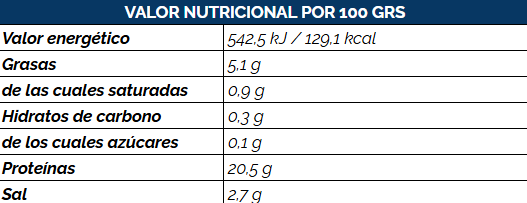 Peso neto 85gr, peso escurrido 55gr. Conservarse entre 5º y 12º.
